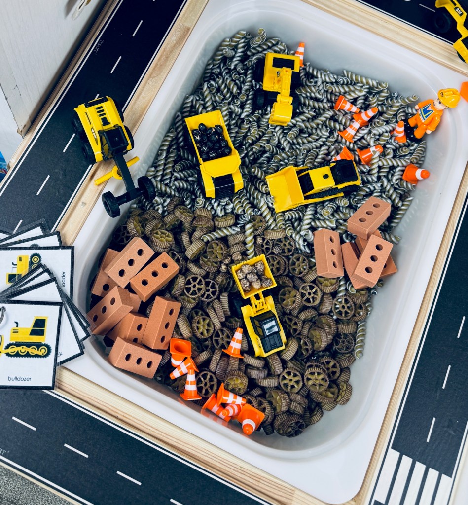 I had so much fun creating this construction sensory bin. I had so many ideas going through my brain that I really had to stop and come down to earth and decide on just a few of my ideas. I knew the kids were going to go nuts (and bolts) over this one…from filling all the little vehicles with rocks and dirt (colored chick peas), making tire tracks in the mud (brown play dough) and cementing the bricks together! The kiddos never wanted to stop playing! I sprinkled in some fun counting cones and construction vehicle cards for added educational play.