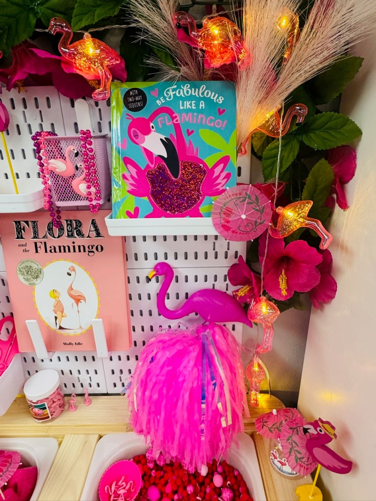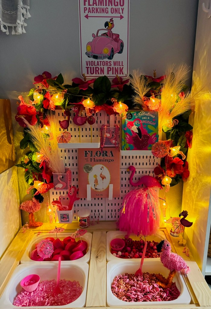 Get ready to ruffle some feathers! This sensory bin is all about pink playful fun! Inspired by the bright and beautiful flamingo, this bin is filled with soft textures, shiny accents, and plenty of opportunities for little hands to scoop, pour and pretend. Think tropical flowers, mini flamingos, and pretty much anything pretty in pink!
