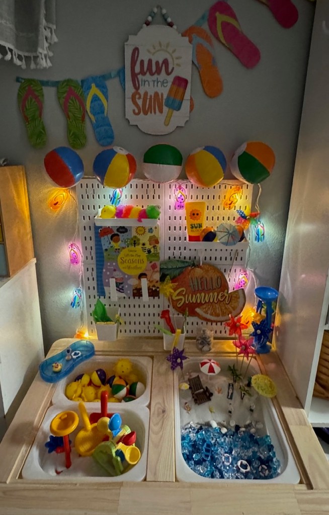 We brought the beach indoors with this bright and breezy sensory bin! Filled with sand, water (fake), seashells, ocean treasures, pails and shovels, it’s the perfect way to dig, pour and explore! This bin sparks imaginative play while capturing all the sunny fun of a day at the seashore – without the need of sunscreen!