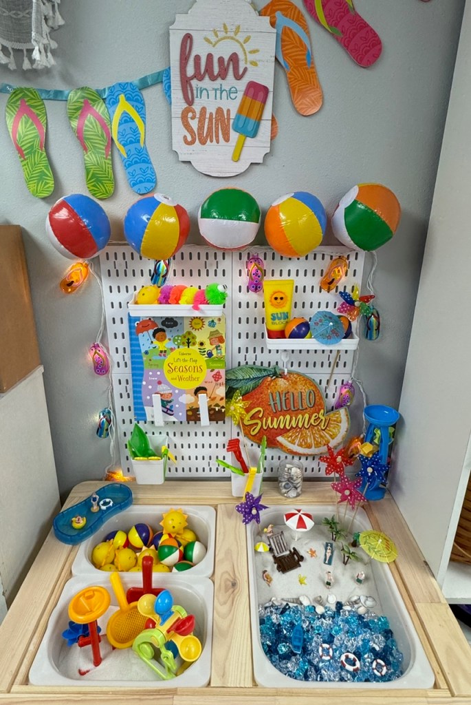 I used sand (washed, white), shades of blue and clear acrylic crystals, mini beach balls and tiny suns for the fillers in this beachy theme! The rest of my items used are listed below the images. Anything not listed was purchased somewhere other than Amazon (Dollar Tree, Hobby Lobby, etc). I also reuse a lot of my sensory items on various themes.
