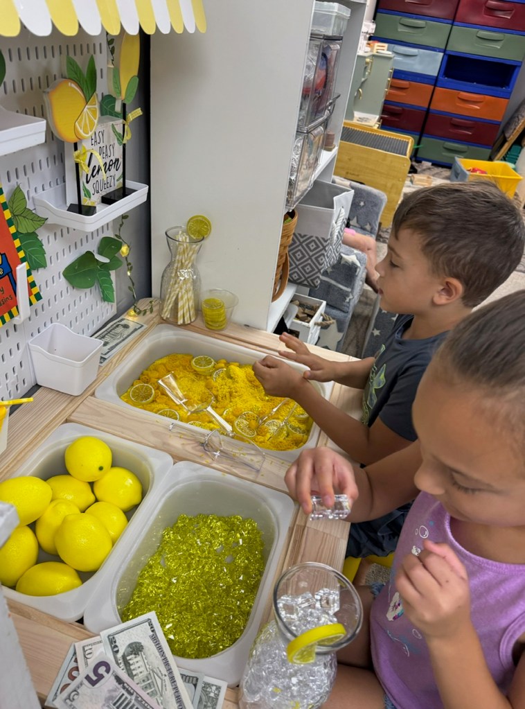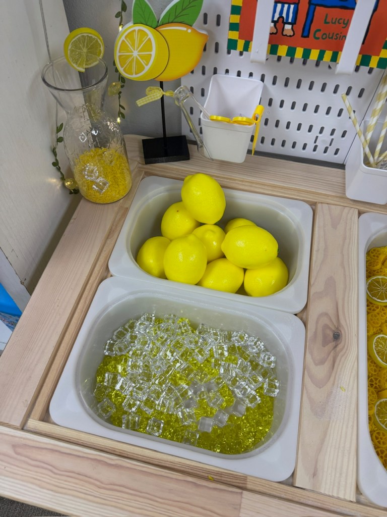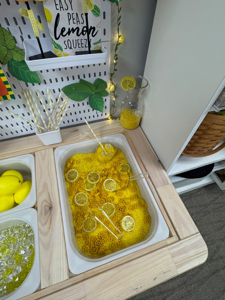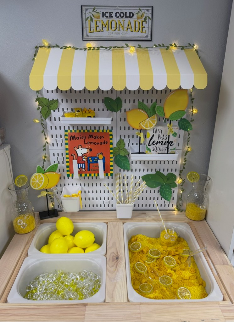 Why do we love it? Scoop, pour, and stir – builds fine motor skills. Pretend, shop and serve – encouraging social play. Talk about lemons – sweet vs. sour, colors and counting.