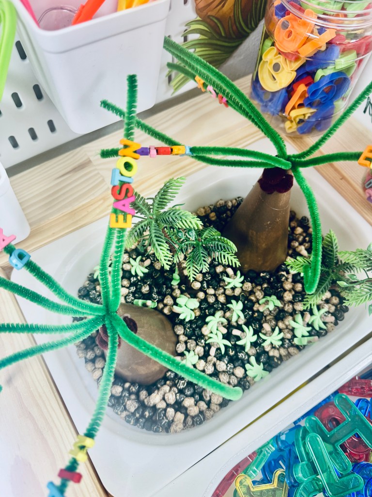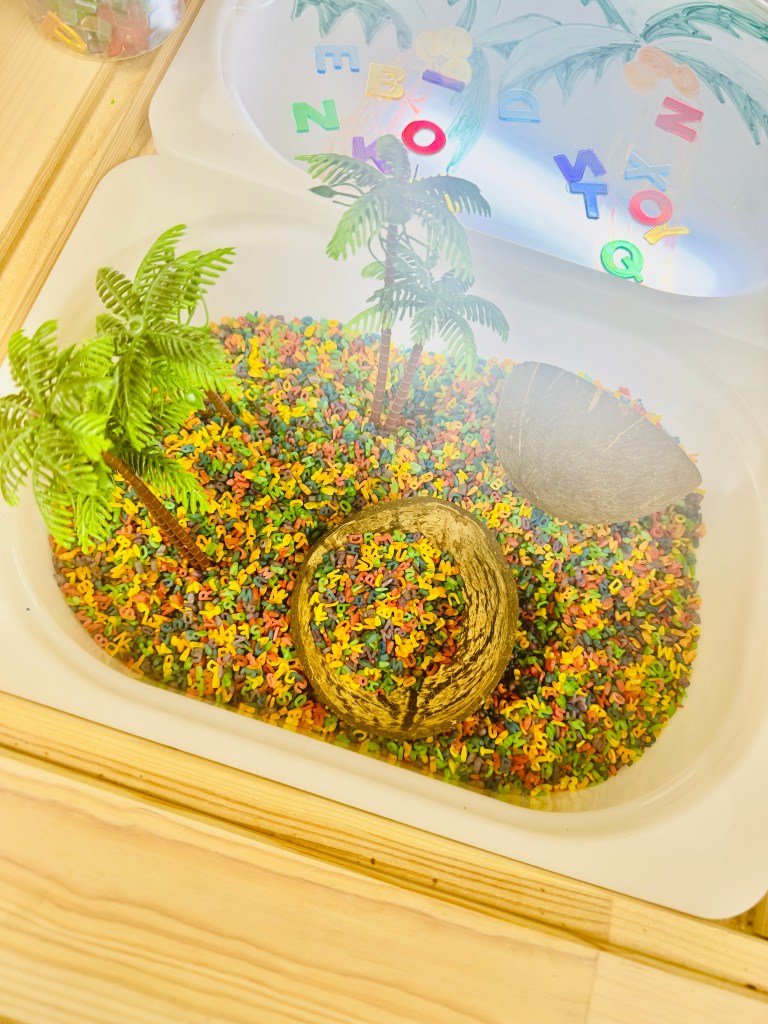 For this filler, I used little alphabet noodles and chick peas that I colored. They love putting the letters on the trees that are made of papier-mâché cones with pipe cleaners, putting the letters on the magnetic tree, using the light board with the translucent numbers and they had so much fun using our coconut counting cads to place the corresponding amount of coconuts (chick peas) on the tree.