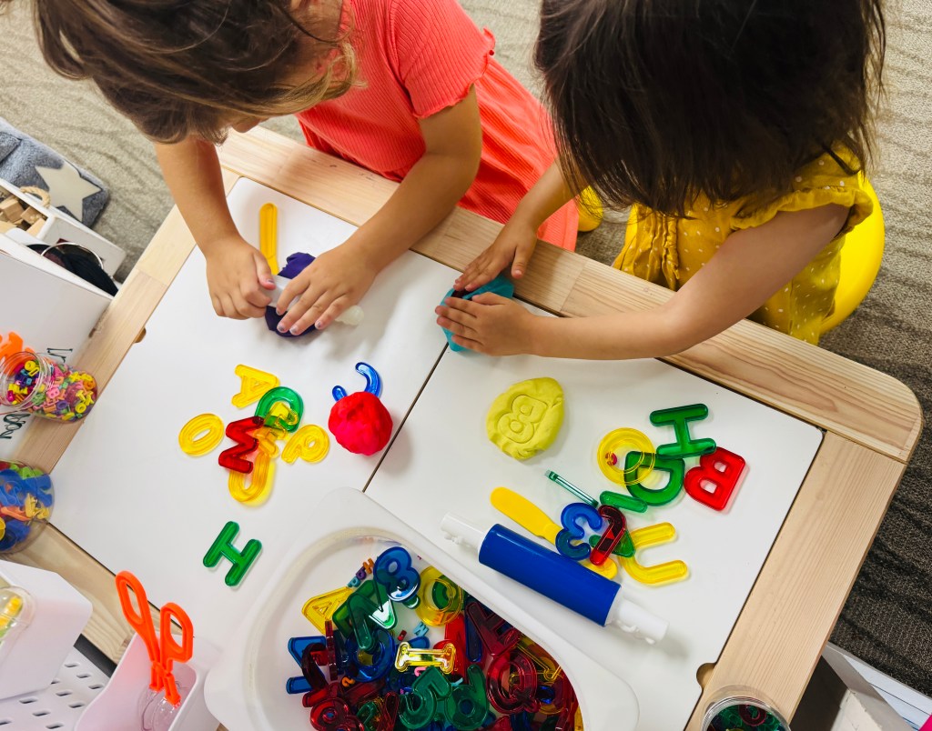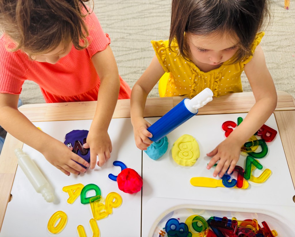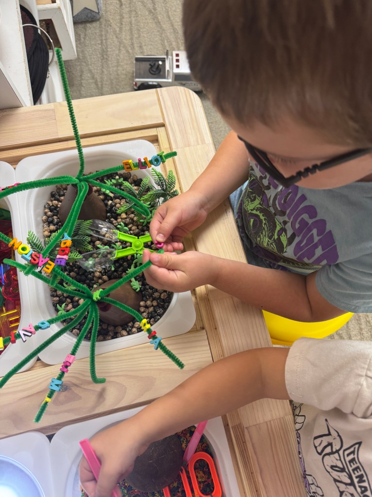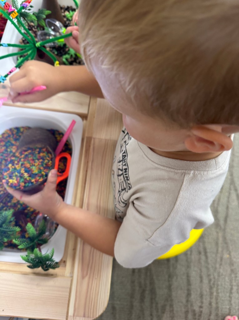 They had just as much fun scooping the fillers with the coconuts and scoops. we were also able to convert the table by putting the covers on to make a flat surface to use play dough with larger letters. This is definitely one of their favorite sensory tables. Most items I used are listed below along with links!