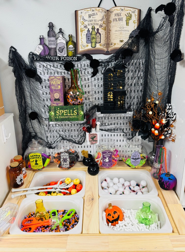 Here’s a fun Halloween-themed sensory table I set up recently that was a big hit with the group. I called it Pick Your Poison, and the setup gave kids a chance to explore all kinds of spooky textures and pretend play, while staying lighthearted and silly.