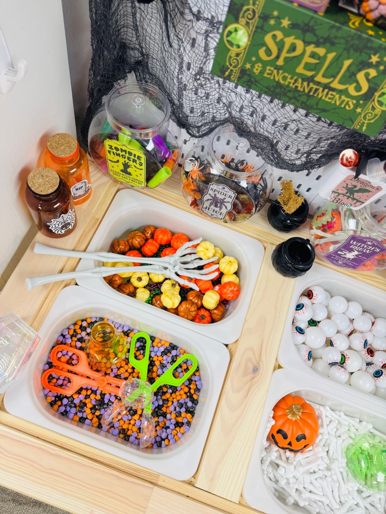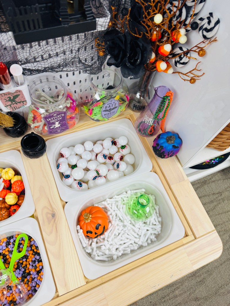 The table included things like “zombie fingers,” glow-in-the-dark eyeballs, mini pumpkins, and lots of squishy and crunchy textures to sort, pour, and scoop. I added potion bottles, bowls, and tools for mixing, plus labeled jars and little containers for pretend shopping or spell-making. Above the table, we used simple props like spell books and a haunted house backdrop to help set the scene; nothing fancy, but enough to spark their imaginations.